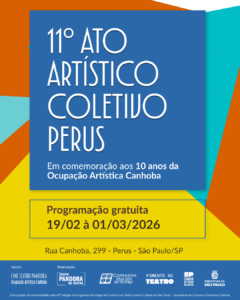 De 19 de Fevereiro a 01 de Março de 2026 (de quinta à domingo), o Grupo Pandora de Teatro e a Ocupação Artística Canhoba promovem o 11º Ato Artístico Coletivo Perus, um festival com entrada gratuita que contará com uma programação especial em comemoração aos 10 anos da sede do Grupo.